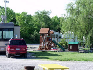 They have 73 sites here at Indian Springs including 13 pull-thrus. We took a back in site by the lake. It had full hook-ups and 50 amp service. We do not mind backing into a site, especially if we plan to stay for a few days. Here is the row of pull-thru sites and our site with the playground beside us. We did not mind having the playground next to us. There were a few children camping this weekend and we could hear them laughing and playing. The day when I am too grumpy to enjoy the laughter of children in a campground is the day I want to hang up our wheels!