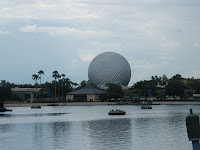 This is the Spaceship Earth ride at Epcot. It looks like a giant golf ball. It is in the Future World part of the park. You ride in a car that goes up and up inside this sphere. It is like time traveling as you go back to prehistoric man and move forward in time. It is also an interactive ride. There is a small computer screen in front of you and when you begin there are 6 or 8 language choices on the screen and you tap the one you want. English for us, naturally. Bruce had an interesting experience on our last trip through Spaceship Earth. He rode with Zoey (2 per seat) and she got in first. Before he could do anything she tapped the screen for the language choice. He didn't really pay too much attention and then as the ride began he realized that the narration for them was being done in French. Toward the end of the ride you can play with the computer screen again, and choose your own future. Everything they had to choose from was in French. When their little movie played back for them, it was narrated in French as well.