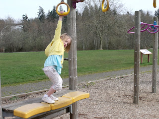 After lunch the girls played on some of the playground equipment. Zoey looked at those rings. They sure looked high off the ground.