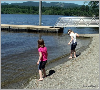 We hadn’t brought swim suits for the girls, but I let them wade in the water anyway…..the water was cold! They gingerly stepped in…..and then went a bit further. They got the bottoms of their shorts wet, but that’s OK. Next time we’ll pack swim suits in the tote bag.